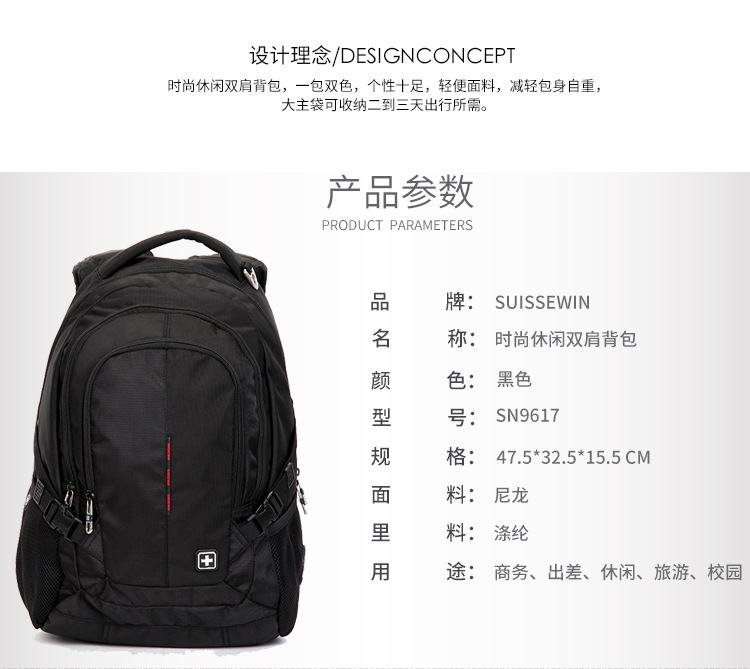 SUISSEWIN商务男潮电脑大容量双肩包防泼水减震户外旅行休闲背包