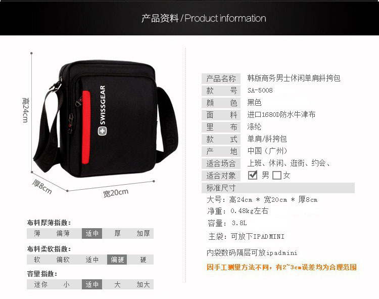 瑞士军刀单肩包男斜挎包学生男青年牛津布休闲牛津布小挎包定制