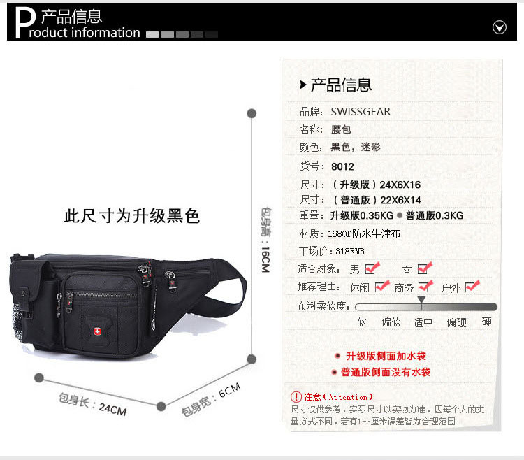 瑞士军刀新款户外运动跑步男腰包 多功能防水防盗休闲挎包 定做